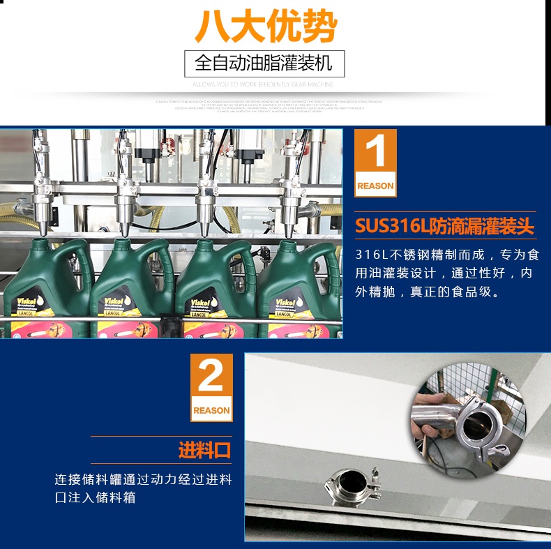 本机是根据润滑油的特性而设计的一款全自动称重式润滑油灌装机,该机设计紧凑合理,外形简洁美观大气,灌装量调节方便,精度高,借鉴灌装流程控制技术,进口彩色触摸屏人机界面,灌装进程实现一键式操作,性能稳定。采用两个316储油箱解决灌装量大的问题,一个进油口控制两个油箱的液位,一个储油罐分别控制5个灌装头,速度更快,精度更高。