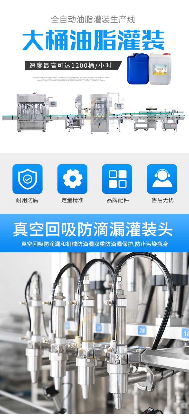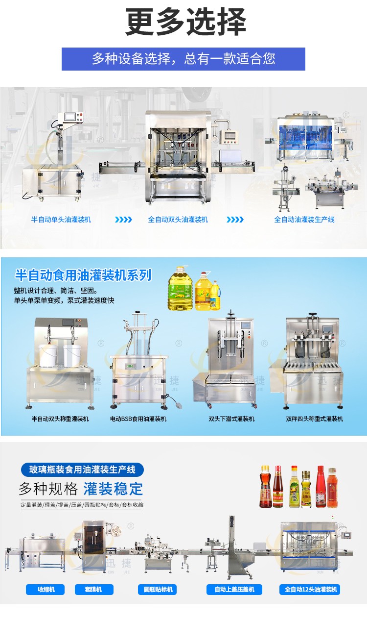 全自动油脂灌装生产线适用于灌装各种油类及粘稠液体,如花生油、调和油、菜籽油等食用油的灌装。可根据灌装需求定制机型。