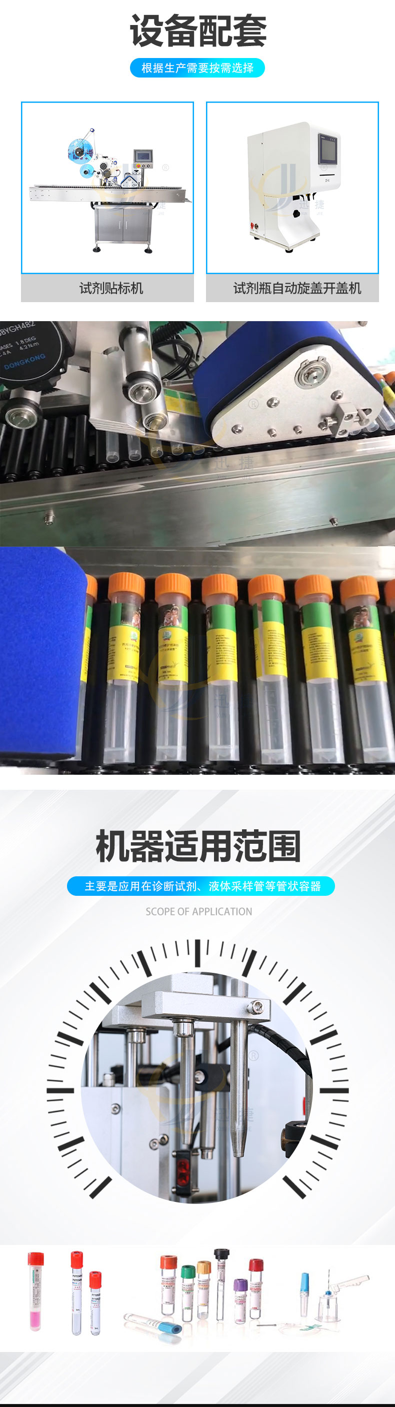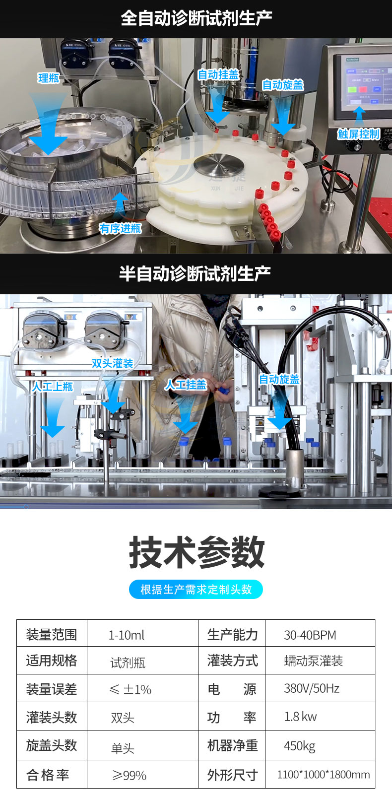 诊断试剂灌装旋盖机适用于诊断试剂、液体采样管等管状容器。本机可选配防尘罩搭配层流罩(FFU)结构,可达到局部百级环境下完成灌装及封盖。