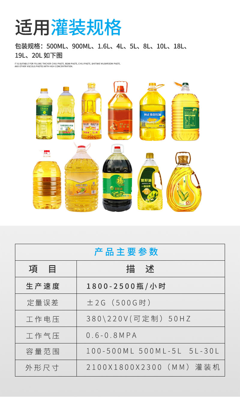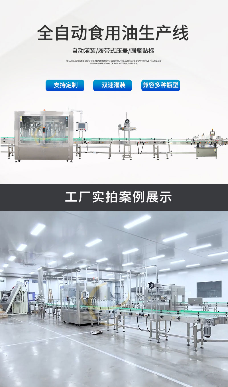 全自动食用油灌装生产线根据用户需求非标定制,灌装部分为八头灌装机,适用于不同瓶子的灌装,配备压盖机和贴标机,自动化程度高。