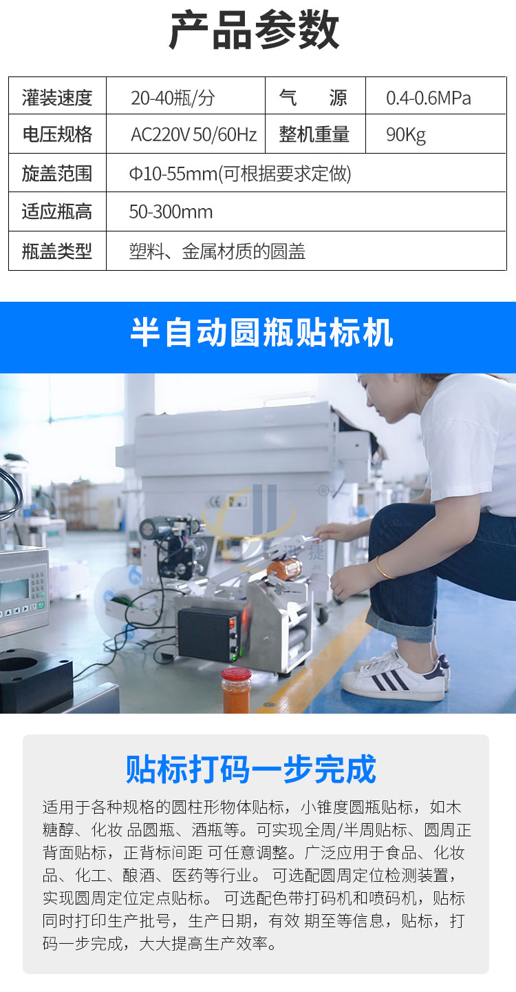 小型酱料灌装生产线又名酱料灌装三剑客,由半自动酱料灌装机+半自动真空旋盖机+半自动圆瓶贴标机组合而成。