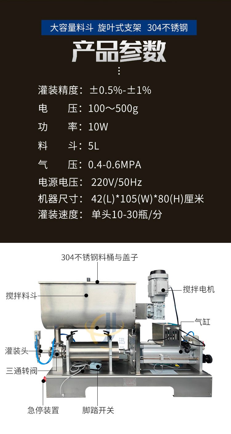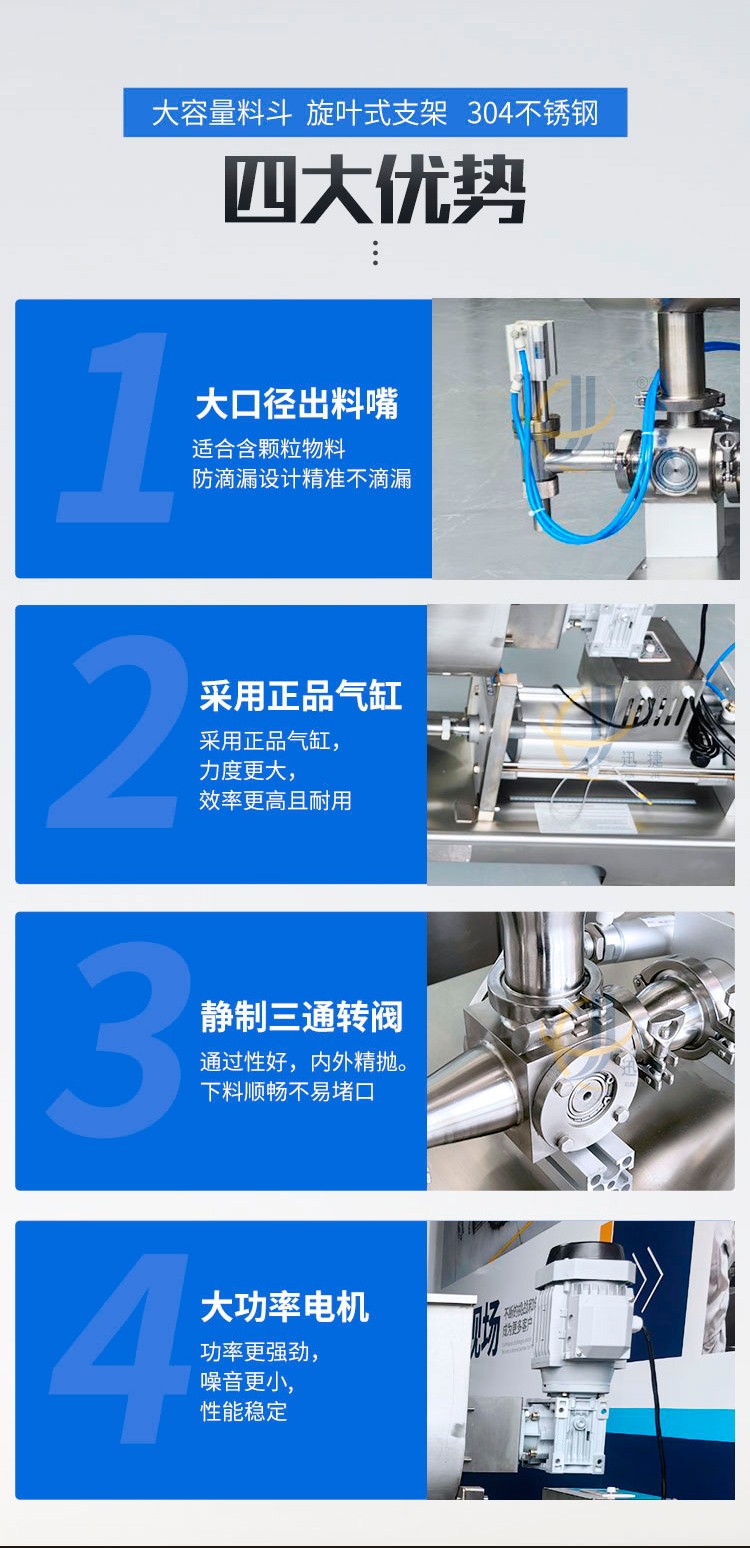 本灌装机采用台湾正品亚德客气缸,力度更大,效率更高!超大不锈钢料斗,带自动搅拌功能,保证灌装产品,使产品灌装更加均匀!灌装嘴采用钢精制成,精确灌装不堵塞,防滴漏设计带产品自提功能,灌装更准确!