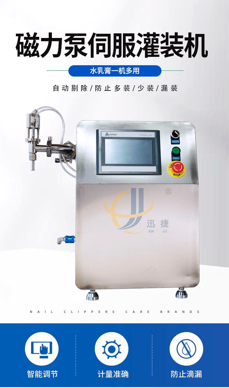 本机采用伺服电机驱动,PLC和触摸屏控制,316L材质齿轮泵灌装原理,适合日化、医药、食品、油脂等各类流体和半流体物料定量灌装。