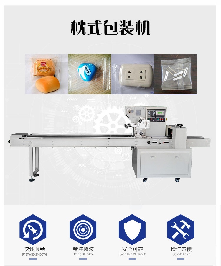 该枕式包装机可用于饼干、月饼、蛋黄派、米饼、雪糕、方便面、巧克力等块状产品的包装,特别适合于小批量单一产品的包装。