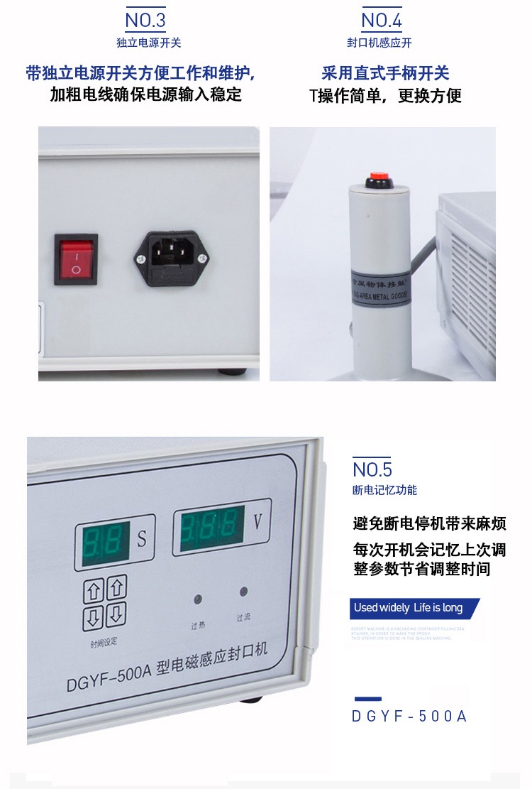 该封口机为手持式铝箔封口机,是一种便携式电磁感应加热封口设备,专为制药、化工、农药、食品、化妆品、轻工行业对容器进行铝箔严密封口