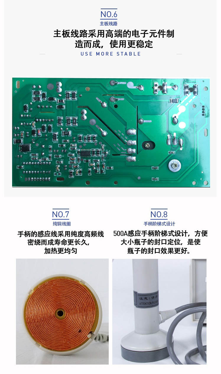 本机采用国外先进线路,选用日本新模块化功率器件,较于一般电子感应加热器更省电,热效率达到90%以上,瞬时加热速度为后者的20-30倍,因此不仅 适用于热封性能较好的聚乙烯、聚丙烯材质的瓶体,而且对热封性能较差的聚酯瓶、玻璃瓶也有极好的封口效果。